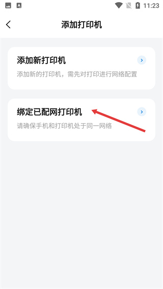 3、在添加選項中,選擇【綁定已配網(wǎng)打印機(jī)】,進(jìn)入打印機(jī)檢測環(huán)節(jié)。