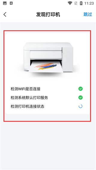 4、進(jìn)入【發(fā)現(xiàn)打印機(jī)】頁面,系統(tǒng)會自動檢測WiFi連接狀態(tài)、系統(tǒng)默認(rèn)打印服務(wù)及打印機(jī)連接狀態(tài),等待檢測完成即可完成配置。