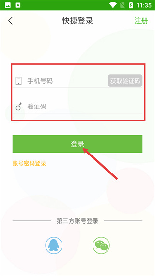 1、進(jìn)入快捷登錄頁(yè)面,在手機(jī)號(hào)輸入框填寫(xiě)號(hào)碼,點(diǎn)擊“獲取驗(yàn)證碼”并填寫(xiě)后,點(diǎn)擊【登錄】按鈕完成登錄,進(jìn)入軟件主界面。