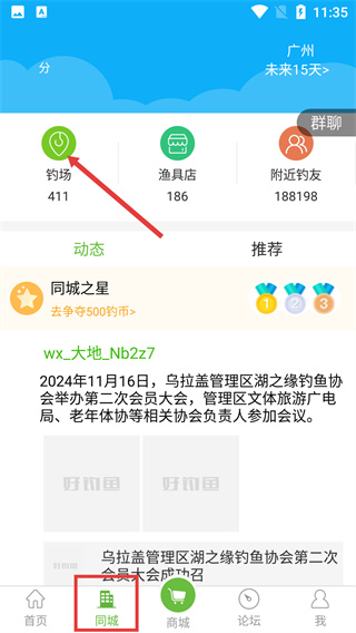2、登錄后切換至【同城】頁(yè)面,點(diǎn)擊功能欄中的【釣場(chǎng)】選項(xiàng),進(jìn)入釣場(chǎng)列表界面,查看各類(lèi)釣場(chǎng)信息。