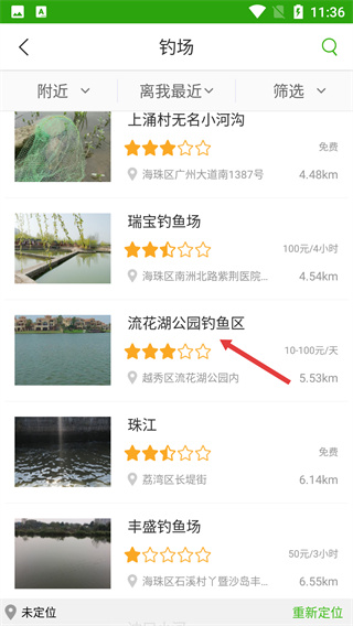 3、在釣場(chǎng)列表中找到目標(biāo)釣場(chǎng),點(diǎn)擊該釣場(chǎng)條目,進(jìn)入其詳情頁(yè)面查看位置、收費(fèi)等信息。