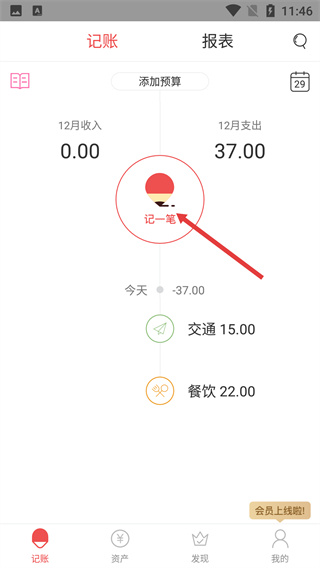 1、進(jìn)入記賬首頁,點擊頁面中間的【記一筆】按鈕,進(jìn)入日常賬本的記賬分類選擇界面。