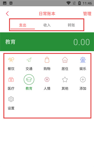 2、在日常賬本頁面,選擇【支出】標(biāo)簽,再從下方分類中選定消費類別。