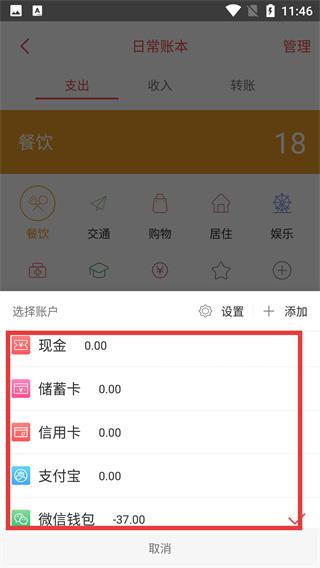 4、在賬戶選擇列表中,選定對應(yīng)的支付賬戶,即可完成本次記賬操作。