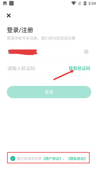 3、勾選【我已閱讀并同意《用戶協(xié)議》《隱私協(xié)議》】后,點擊【獲取驗證碼】按鈕來獲取驗證信息。