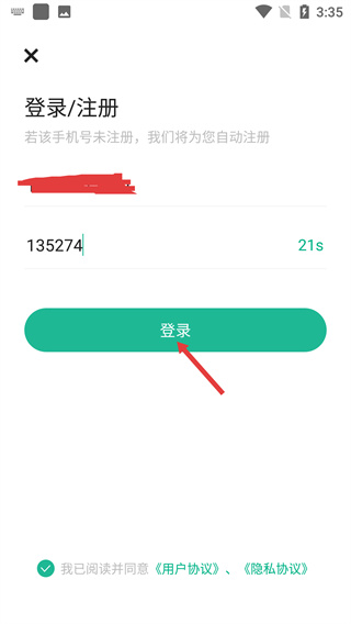 4、在驗證碼輸入框填寫收到的驗證碼后,點擊【登錄】按鈕,完成賬號的注冊登錄操作。