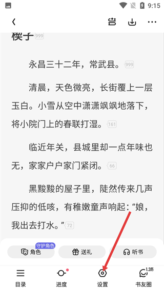 2、在閱讀界面的底部功能欄中,找到【設(shè)置】按鈕并點(diǎn)擊,打開閱讀相關(guān)的配置選項(xiàng)菜單。