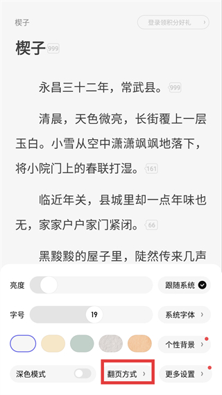 3、在彈出的設(shè)置選項(xiàng)中,找到【翻頁方式】功能入口,點(diǎn)擊進(jìn)入翻頁模式的選擇界面。