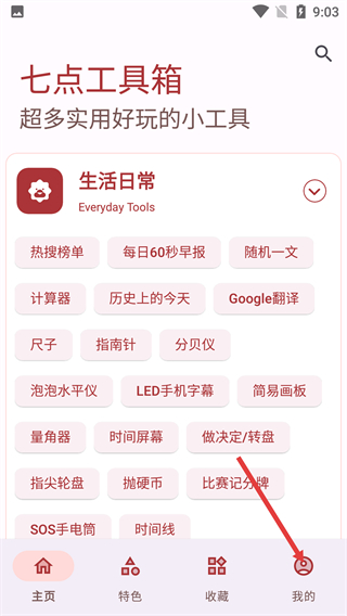 2、在七點(diǎn)工具箱首頁(yè),點(diǎn)擊底部導(dǎo)航欄的【我的】選項(xiàng),進(jìn)入個(gè)人中心頁(yè)面。