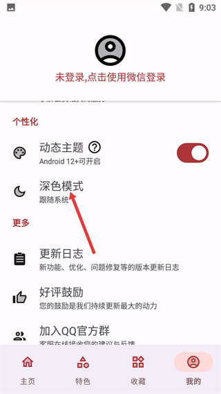 3、在個(gè)人中心頁(yè)面中,找到【深色模式】選項(xiàng)并點(diǎn)擊,彈出深色模式的選擇彈窗。