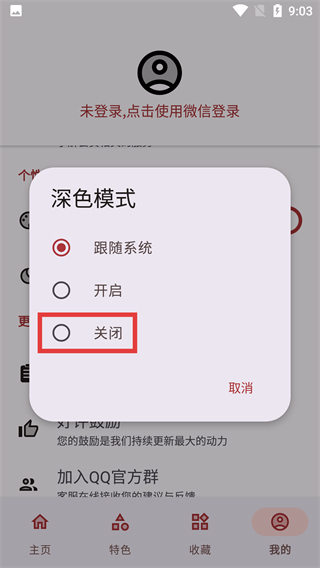 4、在深色模式選擇彈窗里,選中【關(guān)閉】選項(xiàng),即可將應(yīng)用的深色模式切換為關(guān)閉狀態(tài)。