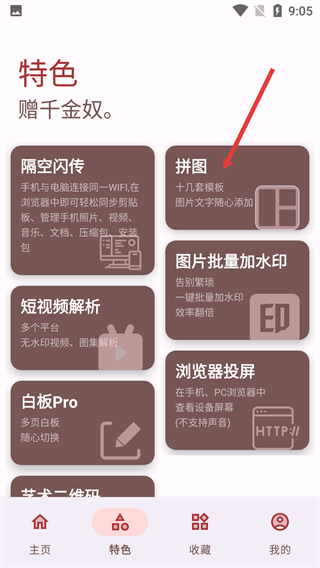 2、在特色功能頁(yè)面中,找到【拼圖】功能入口并點(diǎn)擊,進(jìn)入圖片選擇界面。