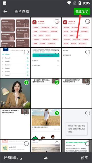 3、在圖片選擇界面中,勾選需要用于拼圖的圖片,選好后點(diǎn)擊右上角的【完成】按鈕。