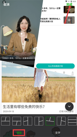 4、進(jìn)入拼圖編輯界面后,點(diǎn)擊底部的【模板】選項(xiàng),可選擇適配的拼圖布局樣式進(jìn)行編輯。