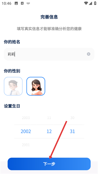 1、在“完善信息”頁(yè)面填寫姓名、選定性別、設(shè)置生日后,點(diǎn)擊“下一步”完成個(gè)人信息的完善。