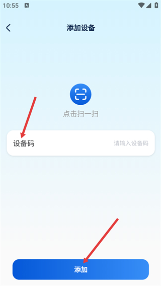 4、在添加設(shè)備界面的“設(shè)備碼”輸入框填寫對(duì)應(yīng)編碼后,點(diǎn)擊“添加”按鈕即可完成設(shè)備的綁定。