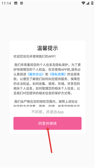 1、使用APP前,需閱讀【服務(wù)協(xié)議】和【隱私政策】,確認相關(guān)條款后點擊【同意并繼續(xù)】按鈕,即可進入APP開啟后續(xù)操作。