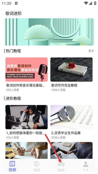 2、在APP底部導(dǎo)航欄點擊【歌詞】選項,進入【歌詞進階】頁面,可查看【熱門教程】與【進階教程】類的歌詞創(chuàng)作學(xué)習(xí)內(nèi)容。