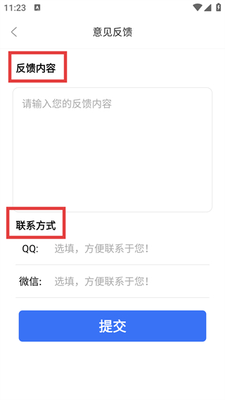 3、進入【意見反饋】頁面,先在【反饋內(nèi)容】輸入框填寫信息,再按需補充【聯(lián)系方式】中的QQ或微信選項。