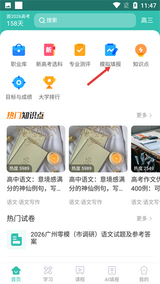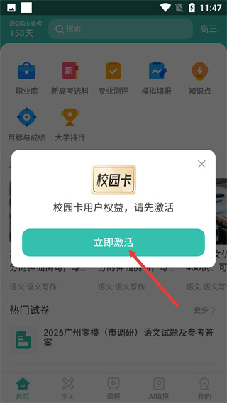 1、在高考輔助應(yīng)用首頁,找到【模擬填報】功能按鈕并點(diǎn)擊,觸發(fā)校園卡權(quán)益激活的提示彈窗。