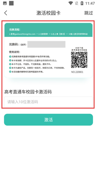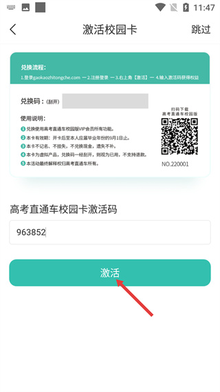4、確認(rèn)激活碼填寫完成后,點(diǎn)擊頁面底部的【激活】按鈕,完成校園卡的權(quán)益激活流程。