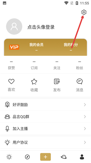 2、進(jìn)入個(gè)人界面后,可進(jìn)行登錄、查看會(huì)員等操作,點(diǎn)擊右上角的【設(shè)置】圖標(biāo),進(jìn)入應(yīng)用的配置管理界面。