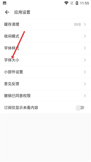 3、在【應(yīng)用設(shè)置】界面中,找到【字體大小】選項(xiàng)并點(diǎn)擊,該選項(xiàng)可用于調(diào)整軟件內(nèi)文字的顯示尺寸。