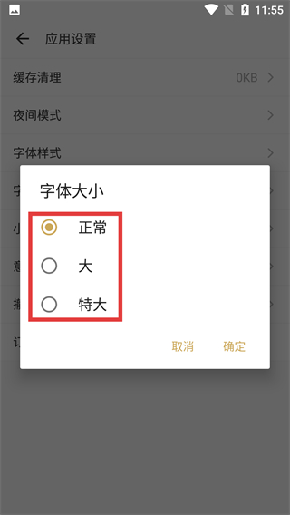 4、點(diǎn)擊【字體大小】后彈出選擇窗口,可選【正?!俊敬蟆俊咎卮蟆咳N尺寸,選定后點(diǎn)【確定】完成設(shè)置。