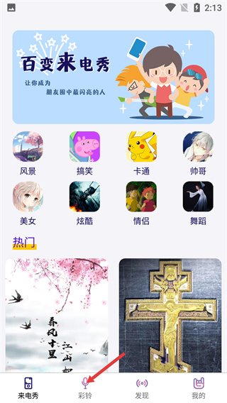 1、進(jìn)入【百變來電秀】首頁,點(diǎn)擊底部【彩鈴】選項(xiàng),進(jìn)入彩鈴分類頁面,可選擇風(fēng)景、搞笑等不同風(fēng)格分類。