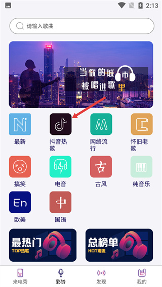 2、在彩鈴分類頁面,點(diǎn)擊【抖音熱歌】分類選項(xiàng),進(jìn)入對(duì)應(yīng)的音樂列表頁面,查看該分類下的歌曲資源。