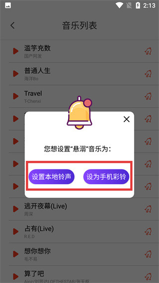 4、在彈出的設(shè)置彈窗里,可選擇【設(shè)置本地鈴聲】或【設(shè)為手機(jī)彩鈴】,完成歌曲的鈴聲配置操作。