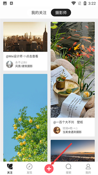1、進入“我的關(guān)注”頁面,點擊底部加號按鈕,調(diào)出包含多種操作選項的彈窗,準備開展內(nèi)容創(chuàng)建相關(guān)操作。