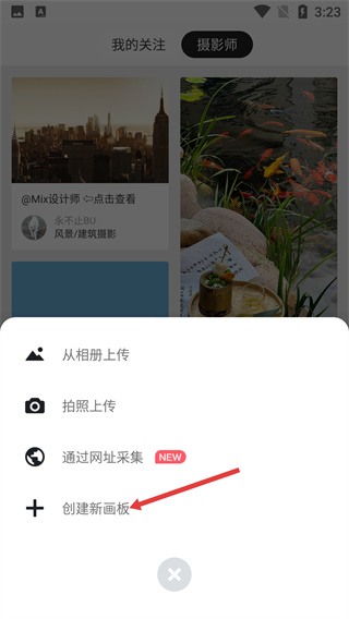2、在彈出的操作選項中,選擇“創(chuàng)建新畫板”選項,進入畫板的信息填寫界面,準備配置畫板的各項內(nèi)容。