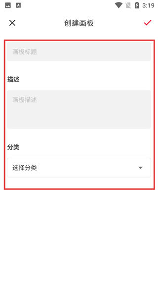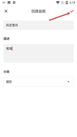 4、在“創(chuàng)建畫板”頁面填寫好標題、描述,選定分類后,點擊右上角確認按鈕,完成新畫板的創(chuàng)建操作。