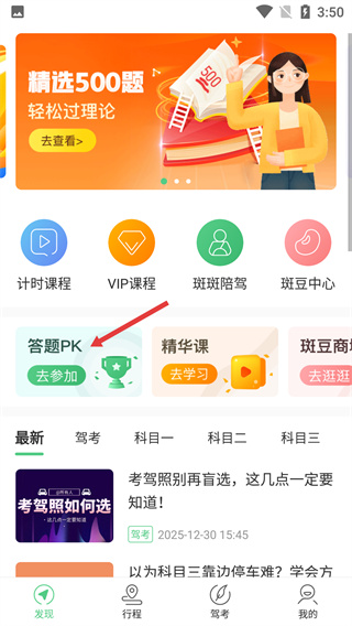 1、進入駕考APP的發(fā)現(xiàn)頁面,找到【答題PK】模塊,點擊其下的【去參加】按鈕,進入答題競賽頁面。