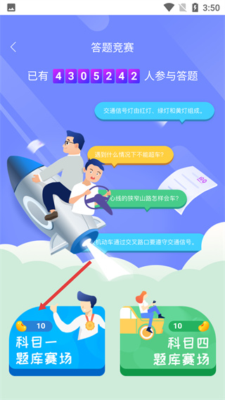2、在答題競賽頁面,選定【科目一題庫賽場】選項,進入與其他用戶的答題對戰(zhàn)界面,準備參與答題。