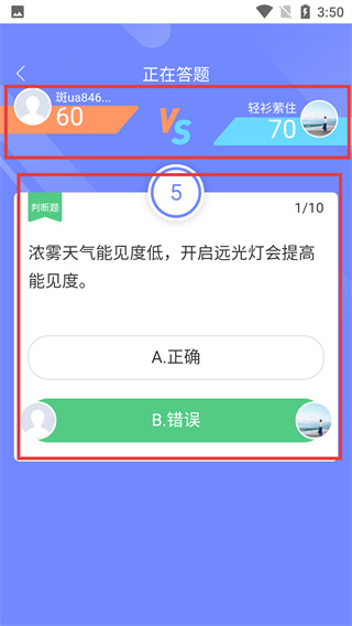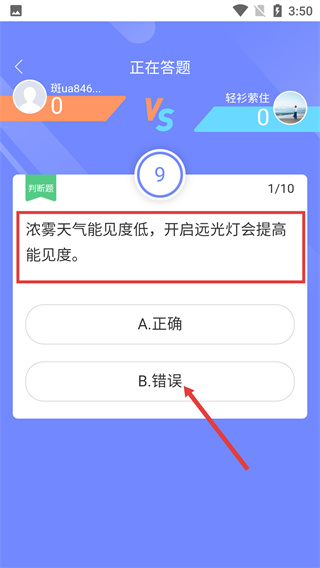 3、在答題對戰(zhàn)界面,面對【濃霧天氣開啟遠光燈提高能見度】的判斷題,選擇【B.錯誤】選項完成該題作答。