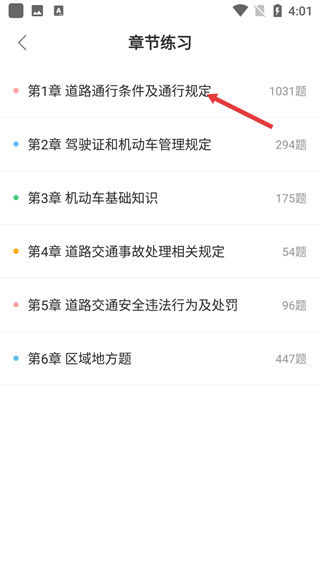 3、在章節(jié)練習(xí)頁面,選定【第1章-道路通行條件及通行規(guī)定】,進(jìn)入該章節(jié)對應(yīng)的題目作答界面。