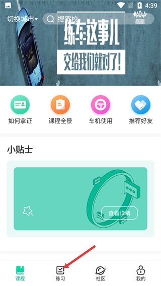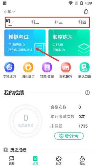 1、進入APP的課程頁面,點擊底部【練習(xí)】選項,切換至涵蓋科一至科四練習(xí)功能的頁面。