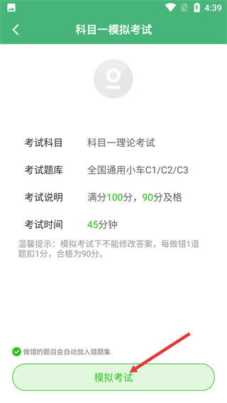 2、在練習(xí)頁面中,點擊【模擬考試】選項,進入科目一模擬考試的信息說明頁面,了解考試規(guī)則。