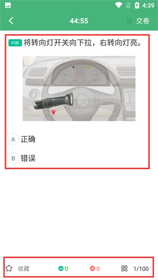 4、進入模擬考試答題界面后,針對轉(zhuǎn)向燈操作的判斷題,選擇對應(yīng)選項完成作答,同時可查看答題進度。