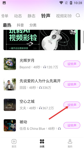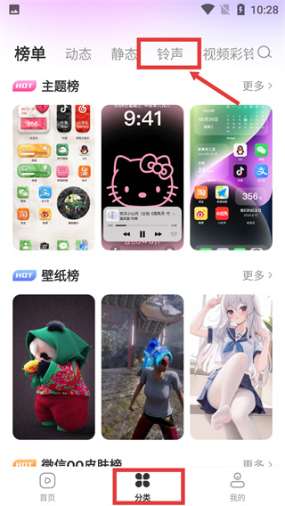 1、進(jìn)入分類頁面,點(diǎn)擊頂部“鈴聲”標(biāo)簽,切換至鈴聲資源板塊,可查看各類鈴聲內(nèi)容。