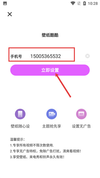 3、在彈出的設(shè)置彈窗中,確認(rèn)顯示的手機(jī)號(hào)信息后,點(diǎn)擊“立即設(shè)置”按鈕推進(jìn)鈴聲設(shè)置流程。
