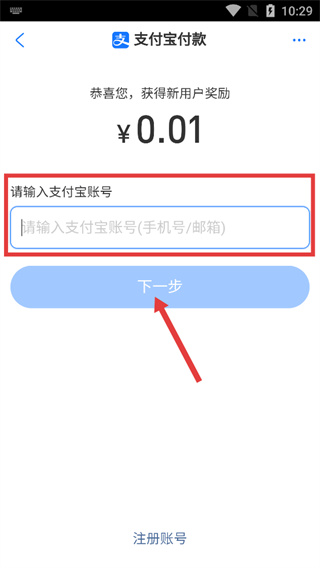 4、進(jìn)入支付寶付款頁面,在輸入框填寫支付寶賬號(hào),點(diǎn)擊“下一步”按鈕完成支付相關(guān)操作步驟。