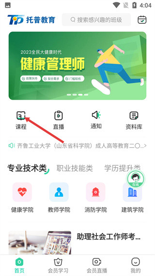 1、進(jìn)入托普教育首頁,點(diǎn)擊“課程”選項(xiàng),進(jìn)入課程分類界面,可查看不同學(xué)院對應(yīng)的課程分類板塊。