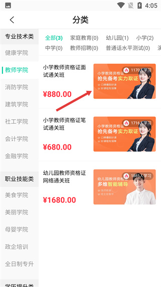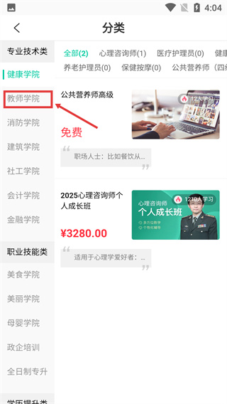 2、在課程分類界面中,點(diǎn)擊“教師學(xué)院”選項(xiàng),切換至教師學(xué)院對應(yīng)的課程展示列表,查看相關(guān)課程。