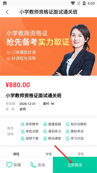4、在該課程的詳情頁面中,點(diǎn)擊“立即報(bào)名”按鈕,即可完成該小學(xué)教資面試課程的報(bào)名操作。