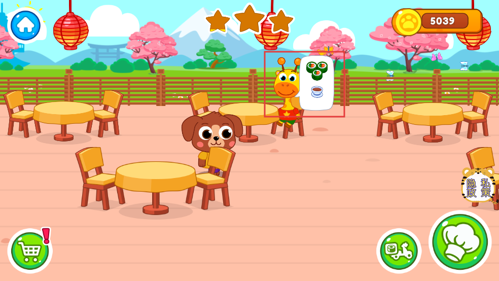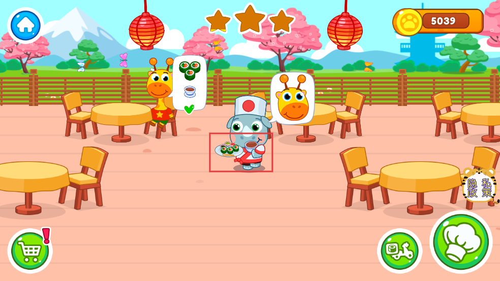 2、準(zhǔn)備好顧客所需的壽司和飲品后,要及時(shí)將這些食物送到長頸鹿顧客處,完成訂單。