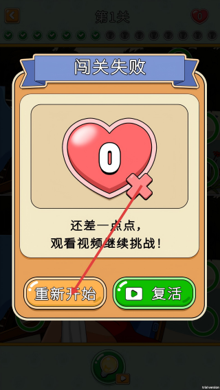 4、若闖關失敗,可選擇【重新開始】或觀看視頻【復活】,繼續(xù)挑戰(zhàn),直至成功通關。