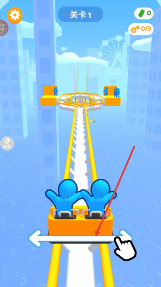 1、關(guān)卡1開(kāi)始,操控載有藍(lán)色小人的黃色小車(chē),沿著軌道行駛,按提示滑動(dòng)屏幕控制方向。